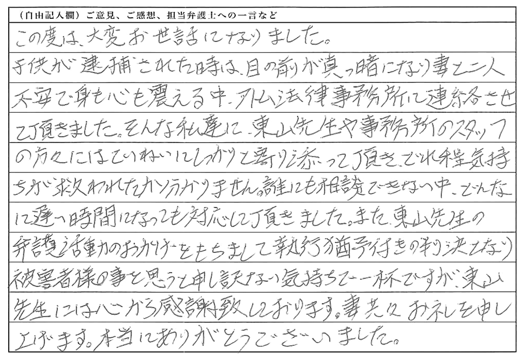 この度は、大変お世話になりました。子供が逮捕された時は目の前が真っ暗になり、妻と二人、不安で身も心も震える中、アトム法律事務所に連絡させて頂きました。そんな私達に、東山先生や事務所のスタッフの方々にはていねいにしっかりと寄り添って頂き、どれ程気持ちが救われたか分かりません。誰にも相談できない中、どんなに遅い時間になっても対応して頂きました。また、東山先生の弁護活動のおかげをもちまして、執行猶予付きの判決となり被害者様の事を思うと申し訳ない気持ちで一杯ですが、東山先生には心から感謝致しております。妻共々お礼を申し上げます。本当にありがとうございました。