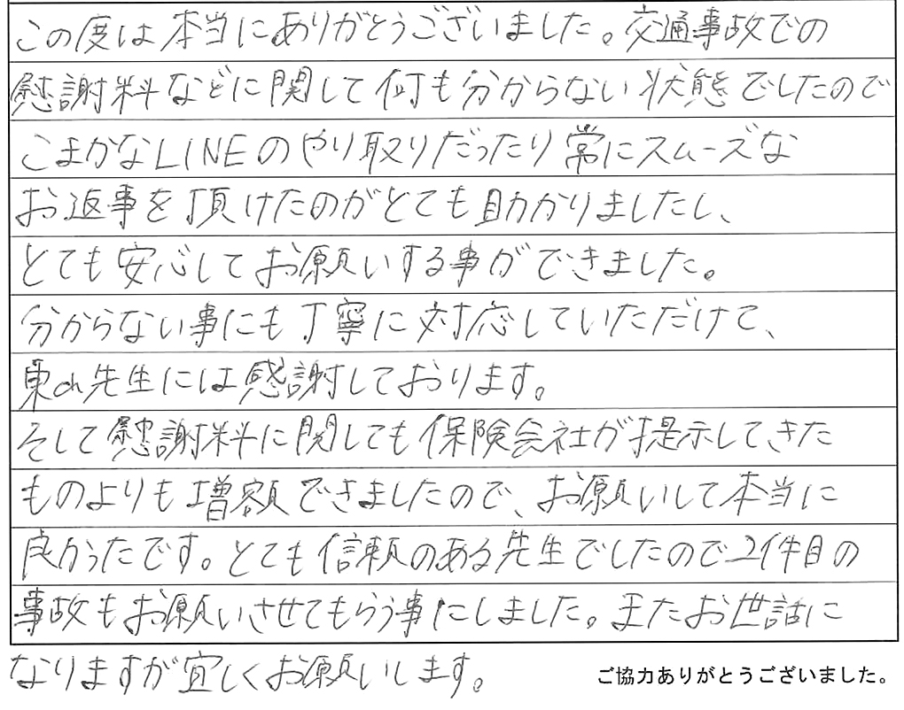 この度は本当にありがとうございました。交通事故での慰謝料などに関して何も分からない状態でしたので、こまかなLINEのやり取りだったり、常にスムーズなお返事を頂けたのがとても助かりましたし、とても安心してお願いする事ができました。分からない事にも丁寧に対応していただけて、東山先生には感謝しております。そして、慰謝料に関しても保険会社が提示してきたものよりも増額できましたので、お願いして本当に良かったです。とても信頼のある先生でしたので、2件目の事故もお願いさせてもらう事にしました。またお世話になりますが、宜しくお願いします。