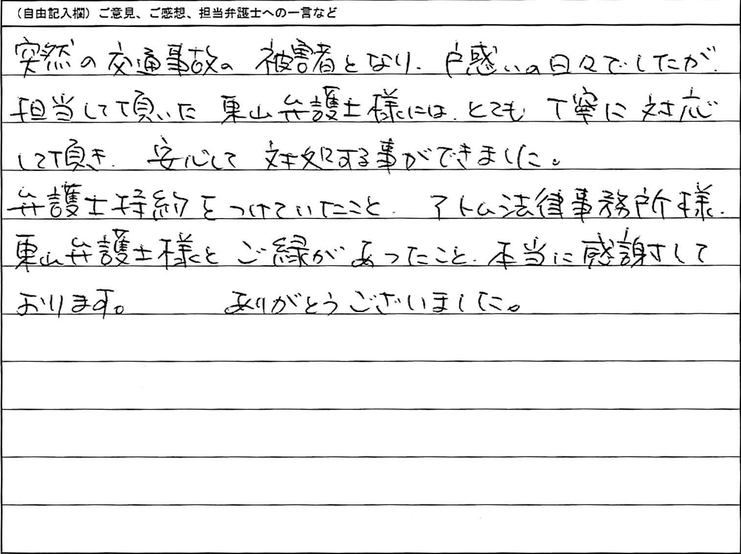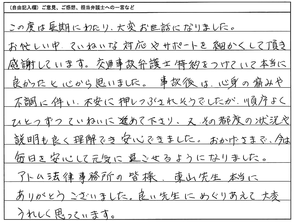 この度は長期にわたり、大変お世話になりました。お忙しい中、ていねいな対応やサポートを細かくして頂き感謝しています。交通事故弁護士特約をつけていて本当に良かったと、心から思いました。事故後は、心身の痛みや不調に伴い、不安に押しつぶされそうでしたが、順序よくひとつずつていねいに進めて下さり、又、その都度の状況や説明も良く理解でき、安心できました。おかげさまで、今は毎日を安心して元気に過ごせるようになりました。アトム法律事務所の皆様、東山先生、本当にありがとうございました。良い先生にめぐりあえて大変うれしく思っています。